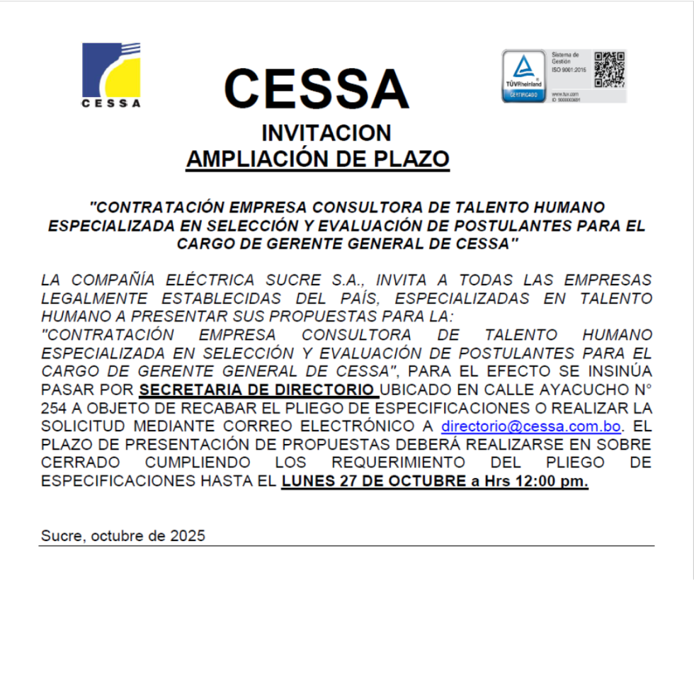 La Compañía Eléctrica Sucre S.A., invita a todas las empresas y profesionales del rubro a presentarse a la Invitación: